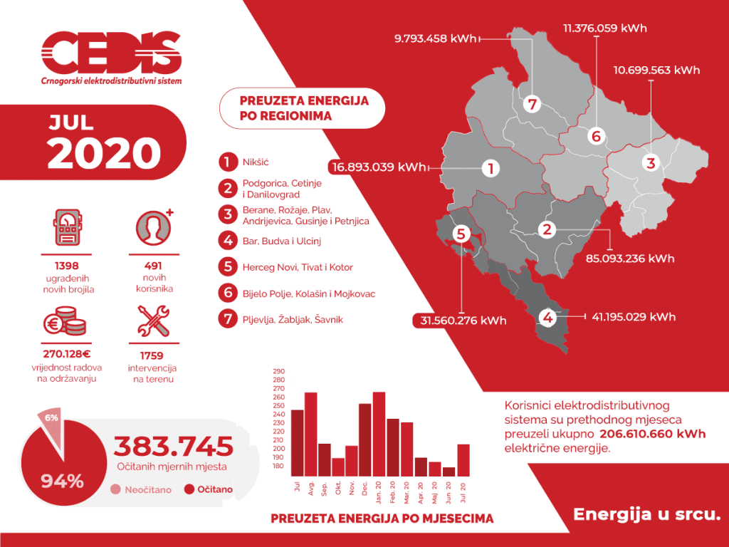 Korisnici elektrodistributivnog sistema su u julu preuzeli ukupno 206.610.660 kWh električne energije, što je za oko 16 odsto manje u odnosu na isti period prošle godine. U opštinama Regiona 4 (Budva, Bar i Ulcinj) zabilježen je pad preuzete energije od 39 odsto u odnosu na vrijednosti ostvarene tokom jula prošle godine. Najviše električne energije, oko 41 odsto, distribuirano je korisnicima na području Podgorice, Danilovgrada i Cetinja (Region 2).