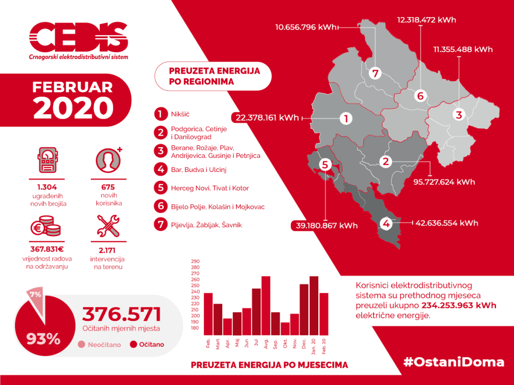 Na distributivnu mrežu je tokom februara priključeno 675 novih korisnika.Prethodnog mjeseca na području Crne Gore je ugrađeno 1.304 novih, elektronskih brojila. Ukupan broj mjernih mjesta u Crnoj Gori koja su opremljena elektronskim brojilima na daljinsko upravljanje je oko 323 hiljade, čime je pokriveno oko 79 odsto konzuma.