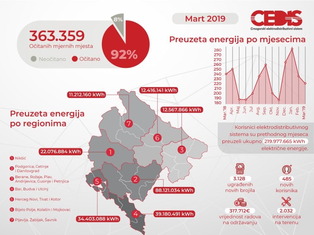 Prethodnog mjeseca je očitano ukupno 363.359 mjernih mjesta, ili 92 odsto od ukupnog broja (neočitana mjerna mjesta nalaze se u objektima koji nijesu stalno nastanjeni). Procenat očitanosti na mjernim mjestima koja su opremljena novim, elektronskim brojilima je 99 odsto.