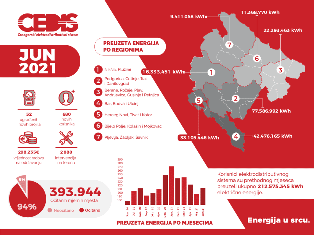 Korisnici elektrodistributivnog sistema su u junu preuzeli ukupno 212.575.345 kWh električne energije, što je čak 20 odsto više u odnosu na isti period prethodne godine. Najviše električne energije, oko 36 odsto, distribuirano je korisnicima na području Podgorice, Danilovgrada i Cetinja (Region 2).