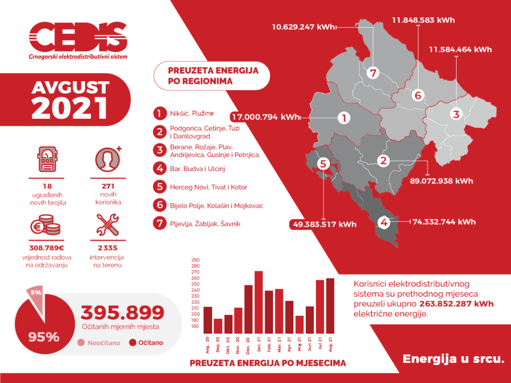 Korisnici elektrodistributivnog sistema su u avgustu preuzeli ukupno 263.852.287 kWh električne energije, što je za 25 odsto više u odnosu na isti period prethodne godine. Najviše električne energije, oko 34 odsto, distribuirano je korisnicima na području Podgorice, Danilovgrada i Cetinja (Region 2).
