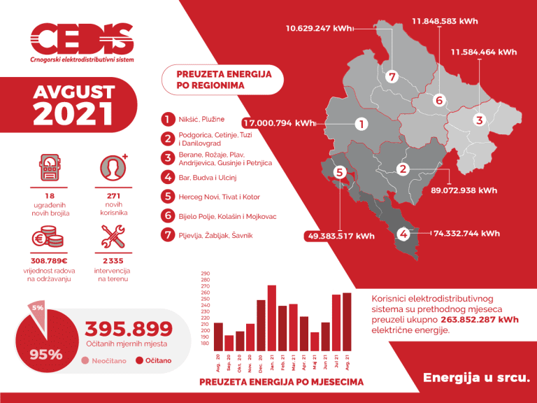 Korisnici elektrodistributivnog sistema su u avgustu preuzeli ukupno 263.852.287 kWh električne energije, što je za 25 odsto više u odnosu na isti period prethodne godine. Najviše električne energije, oko 34 odsto, distribuirano je korisnicima na području Podgorice, Danilovgrada i Cetinja (Region 2). Očitano je ukupno 395.899 brojila, ili 95 odsto od ukupnog broja (neočitana mjerna