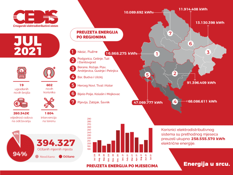 Korisnici elektrodistributivnog sistema su u julu preuzeli ukupno 258.555.570 kWh električne energije, što je 20 odsto više u odnosu na isti period prethodne godine. Najviše električne energije, oko 35 odsto, distribuirano je korisnicima na području Podgorice, Danilovgrada, Tuzi i Cetinja (Region 2). Očitano je ukupno 394.327 brojila, ili preko 94 odsto od ukupnog broja (neočitana