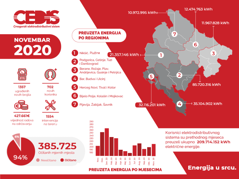 Korisnici elektrodistributivnog sistema su u novembru preuzeli ukupno 209.714.152 kWh električne energije, što je za oko tri odsto više u odnosu na isti period prošle godine. Najviše električne energije, oko 41 odsto, distribuirano je korisnicima na području Podgorice, Danilovgrada i Cetinja (Region 2). Očitano je ukupno 385.725 brojila, ili 94 odsto od ukupnog broja (neočitana