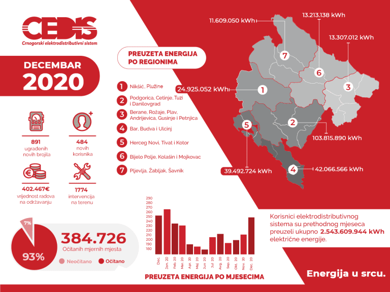 Korisnici elektrodistributivnog sistema su u decembru preuzeli ukupno 248.429.432 kWh električne energije, što je za oko 19% više u odnosu na novembar. Najviše električne energije, oko 42 odsto, distribuirano je korisnicima na području Podgorice, Danilovgrada i Cetinja (Region 2). Tokom prethodne godine ukupno je preuzeto 2.543.609.944 kWh električne energije, što je za oko sedam odsto