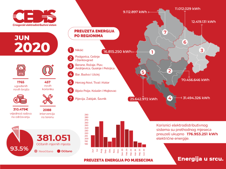 Korisnici elektrodistributivnog sistema su u junu preuzeli ukupno 176.953.251 kWh električne energije, što je za oko 18 odsto manje u odnosu na isti period prošle godine i na nivou potrošnje ostvarene tokom maja. U opštinama Regiona 4 (Budva, Bar i Ulcinj) zabilježen je pad preuzete energije od 39 odsto u odnosu na vrijednosti ostvarene tokom