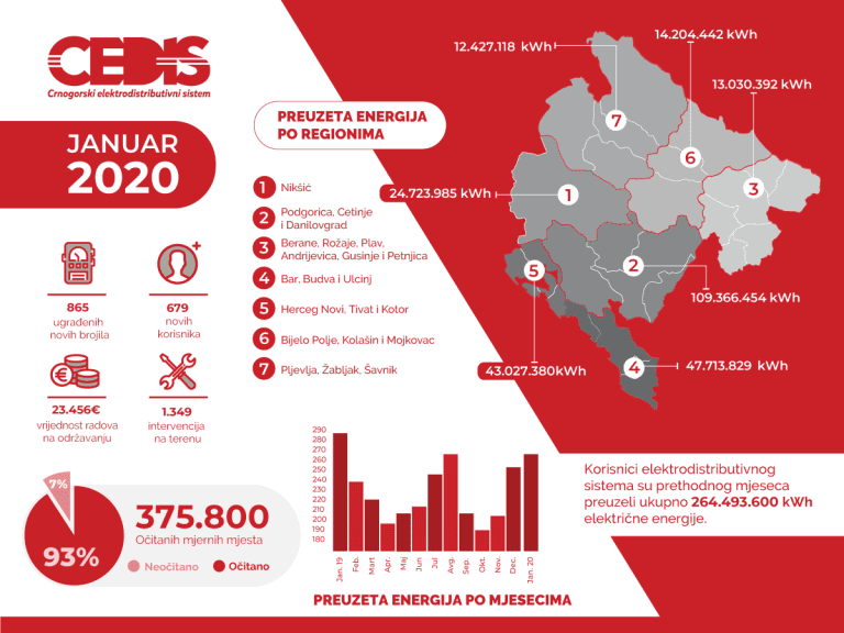 Korisnici elektrodistributivnog sistema su u januaru preuzeli ukupno 264.493.600 kWh električne energije, što je za oko pet odsto više u odnosu na decembarsku potrošnju i za sedam odsto manje u odnosu na potrošnju ostvarenu u istom periodu prošle godine. Najviše električne energije, oko 41 odsto, distribuirano je korisnicima na području Podgorice, Danilovgrada i Cetinja (Region